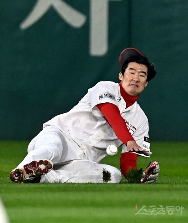 20일 인천 SSG 랜더스필드에서 ‘2021 신한은행 SOL KBO리그’ SSG 랜더스와 NC 다이노스의 경기가 열렸다. 1회초 2사에서 SSG 오태곤이 타구를 잡기 위해 몸을 날렸으나 볼을 잡지 못하고 있다.