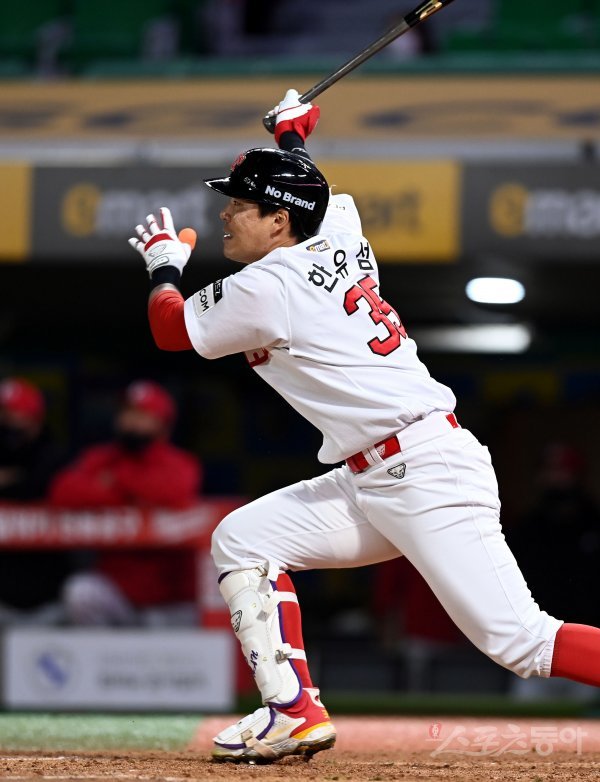 20일 인천 SSG 랜더스필드에서 ‘2021 신한은행 SOL KBO리그’ SSG 랜더스와 NC 다이노스의 경기가 열렸다. 1회말 2사 1, 2루에서 SSG 한유섬이 2타점 3루타를 날리고 있다.