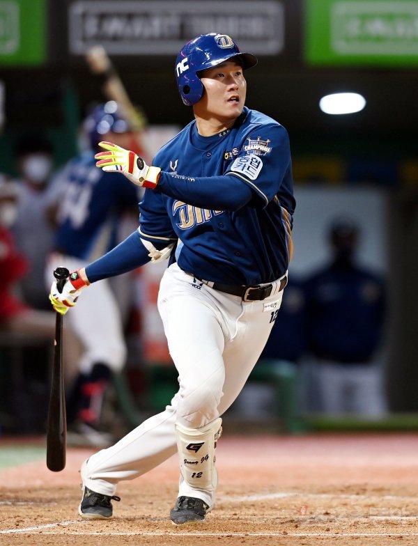 20일 인천 SSG 랜더스필드에서 ‘2021 신한은행 SOL KBO리그’ SSG 랜더스와 NC 다이노스의 경기가 열렸다. 1회초 2사 만루에서 NC 정진기가 2타점 2루타를 날리고 있다.