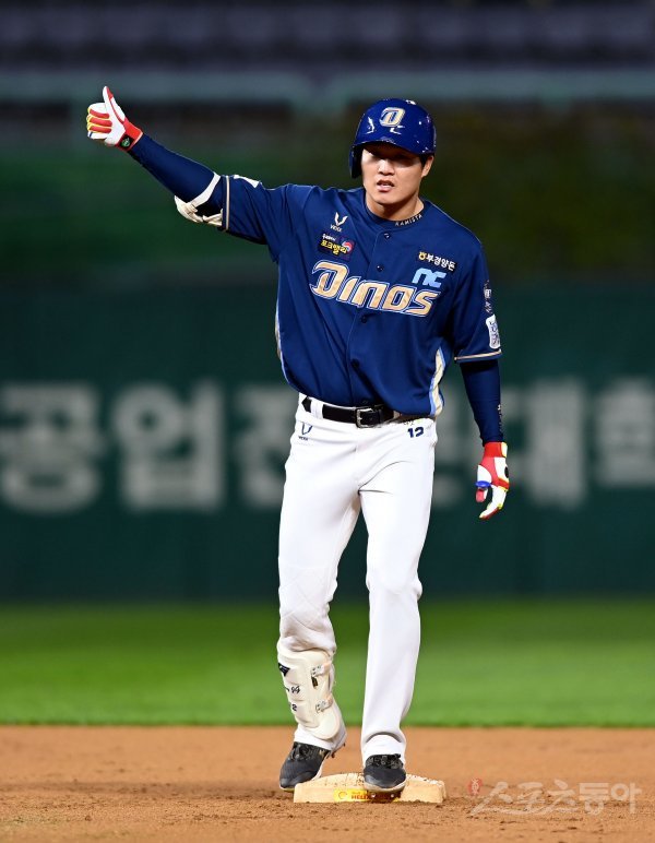 20일 인천 SSG 랜더스필드에서 ‘2021 신한은행 SOL KBO리그’ SSG 랜더스와 NC 다이노스의 경기가 열렸다. 1회초 2사 만루에서 NC 정진기가 2타점 2루타를 날린 뒤 환호하고 있다.