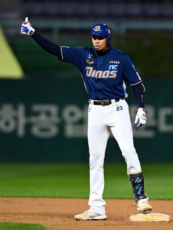 20일 인천 SSG 랜더스필드에서 ‘2021 신한은행 SOL KBO리그’ SSG 랜더스와 NC 다이노스의 경기가 열렸다. 1회초 2사 1, 2루에서 NC 알테어가 1타점 2루타를 날린 뒤 환호하고 있다.