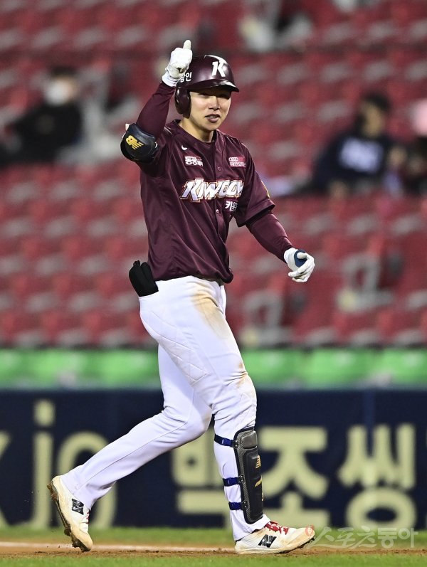 20일 서울 잠실야구장에서 열린 ‘2021 신한은행 SOL KBO리그’에서 LG 트윈스와 키움 히어로즈의 경기에서 5회초 1사 2, 3루 키움 김혜성이 역전 2타점 우전 적시타를 쳐낸 뒤 3루측 더그아웃을 향해 세리머니를 하고 있다.