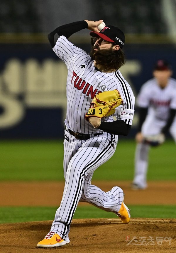 20일 서울 잠실야구장에서 열린 ‘2021 신한은행 SOL KBO리그’에서 LG 트윈스와 키움 히어로즈의 경기에서 선발 투수로 마운드에 오른 LG 켈리가 역투하고 있다.