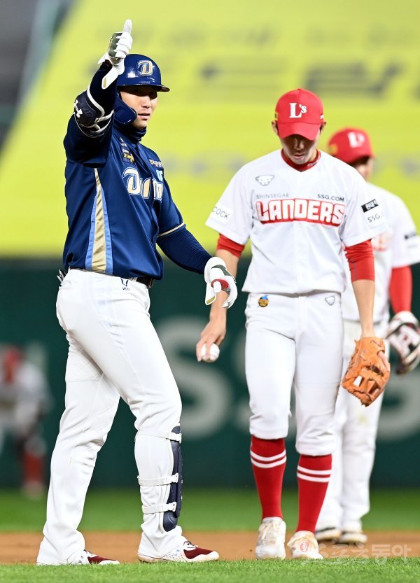 20일 인천 SSG 랜더스필드에서 ‘2021 신한은행 SOL KBO리그’ SSG 랜더스와 NC 다이노스의 경기가 열렸다. 6회초 무사에서 NC 나성범이 2루타를 날린 뒤 세리머니를 펼치고 있다.