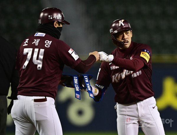 20일 서울 잠실야구장에서 열린 ‘2021 신한은행 SOL KBO리그’에서 LG 트윈스와 키움 히어로즈의 경기에서 7회초 1사 2루 키움 이용규가 1타점 우전 3루타를 쳐낸 뒤 3루코치와 주먹을 맞대고 있다.
