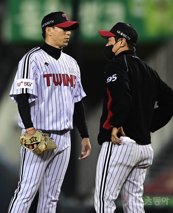 20일 서울 잠실야구장에서 열린 ‘2021 신한은행 SOL KBO리그’에서 LG 트윈스와 키움 히어로즈의 경기에서 7회초 2사 상황에서 LG 고효준이 손가락 통증을 호소하고 있다.