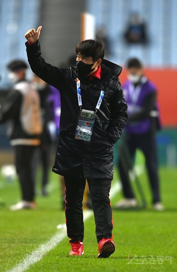 20일 전주월드컵경기장에서 열린 울산과 포항의 2021 아시아축구연맹(AFC) 챔피언스리그(ACL) 4강전에서 승부차기 끝에 결승 진출을 확정지은 후 포항 김기동 감독이 기뻐하고 있다.