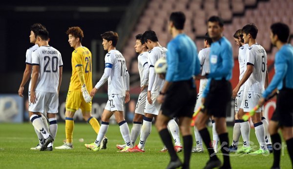 20일 전주월드컵경기장에서 열린 울산과 포항의 2021 아시아축구연맹(AFC) 챔피언스리그(ACL) 4강전에서 승부차기 끝에 패하며 결승 진출이 좌절된 울산 선수읃이 아쉬워하고 있다.