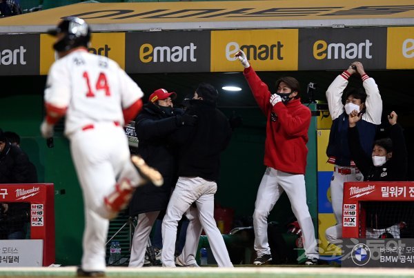 20일 인천 SSG 랜더스필드에서 ‘2021 신한은행 SOL KBO리그’ SSG 랜더스와 NC 다이노스의 경기가 열렸다. 8회말 1사 1, 3루에서 SSG 최정이 동점 3점 홈런을 쏘아 올리자 동료들이 환호하고 있다.