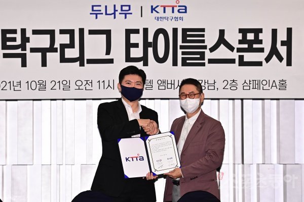 21일 서울 강남구 노보텔 앰배서더 서울 강남에서 대한탁구협회와 두나무의 ‘한국프로탁구리그 타이틀스폰서십 계약 체결식’이 열렸다. 유승민 대한탁구협회 회장과 이석우 두나무 대표가 기념 촬영을 하고 있다.
