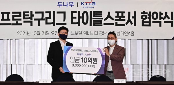 21일 서울 강남구 노보텔 앰배서더 서울 강남에서 대한탁구협회와 두나무의 ‘한국프로탁구리그 타이틀스폰서십 계약 체결식’이 열렸다. 유승민 대한탁구협회 회장과 이석우 두나무 대표가 기념 촬영을 하고 있다.