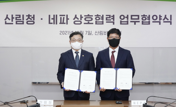 산림청장 최병암(왼쪽)-네파 대표이사 이선효. 사진출처|네파