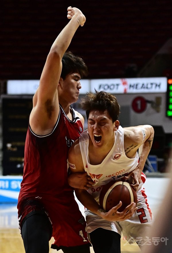 21일 경기도 안양실내체육관에서 열린 ‘2021-2022 KGC 인삼공사 정관장 프로농구’ 안양 KGC와 서울 SK의 경기에서 SK 최준용이 KGC 한승희의 수비에 막혀 소리 지르고 있다.