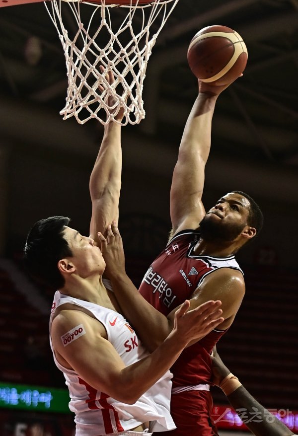 21일 경기도 안양실내체육관에서 열린 ‘2021-2022 KGC 인삼공사 정관장 프로농구’ 안양 KGC와 서울 SK의 경기에서 KGC 스펠맨이 SK 수비 앞에서 덩크를 하고 있다.