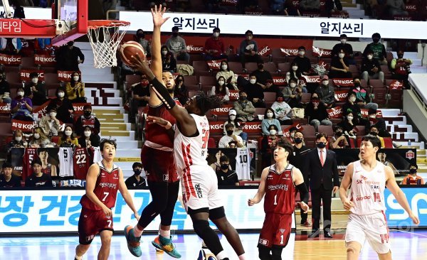 21일 경기도 안양실내체육관에서 열린 ‘2021-2022 KGC 인삼공사 정관장 프로농구’ 안양 KGC와 서울 SK의 경기에서 정부가 발표한 코로나19 방역지침 조정안에 따라 백신 접종을 완료하고 2주가 지난 관중들이 응원을 펼치고 있다.