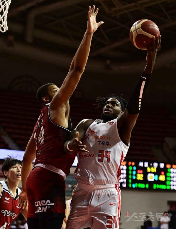 21일 경기도 안양실내체육관에서 열린 ‘2021-2022 KGC 인삼공사 정관장 프로농구’ 안양 KGC와 서울 SK의 경기에서 SK 워니가 KGC 수비 앞에서 슛을 쏘고 있다.