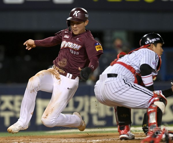 21일 서울 잠실야구장에서 ‘2021 신한은행 SOL KBO리그’ 키움 히어로즈와 LG 트윈스 경기가 열렸다. 3회초 2사 1,2루 키움 안타 때 2루주자 이정후가 홈까지 달려 세이프 되고 있다.