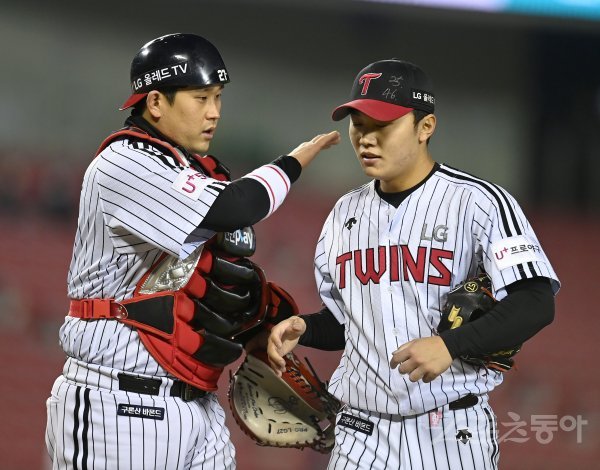 21일 서울 잠실야구장에서 ‘2021 신한은행 SOL KBO리그’ 키움 히어로즈와 LG 트윈스 경기가 열렸다. 4회초 투구를 마친 LG 김윤식을 유강남이 격려하고 있다.