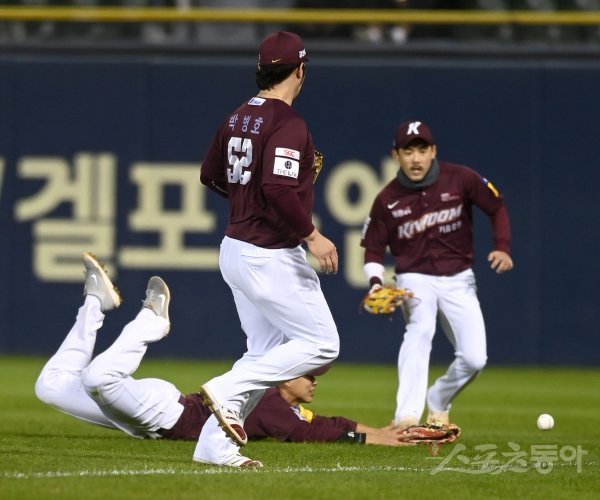 21일 서울 잠실야구장에서 ‘2021 신한은행 SOL KBO리그’ 키움 히어로즈와 LG 트윈스 경기가 열렸다. 1회말 2사 2루 키움 송성문이 LG 채은성의 타구를 다이빙캐치 시도했으나 놓치고 있다.