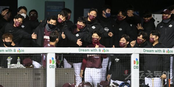 21일 서울 잠실야구장에서 ‘2021 신한은행 SOL KBO리그’ 키움 히어로즈와 LG 트윈스 경기가 열렸다. 5회초 1사 2루 키움 적시타 때 득점한 2루주자 이정후가 팀 동료들의 축하를 받고 있다.