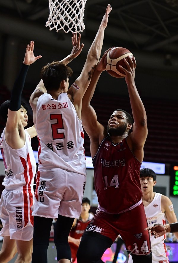 21일 경기도 안양실내체육관에서 열린 ‘2021-2022 KGC 인삼공사 정관장 프로농구’ 안양 KGC와 서울 SK의 경기에서 KGC 스펠맨이 SK 수비수 앞에서 슛을 쏘고 있다.
