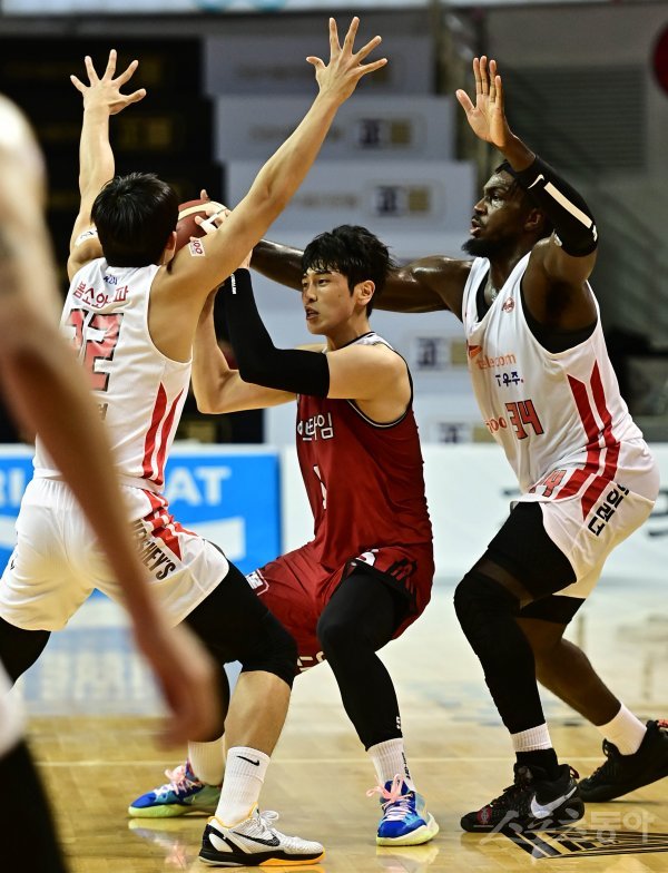 21일 경기도 안양실내체육관에서 열린 ‘2021-2022 KGC 인삼공사 정관장 프로농구’ 안양 KGC와 서울 SK의 경기에서 KGC 변준형이 SK 수비수들 사이에서 패스할 동료를 찾고 있다.