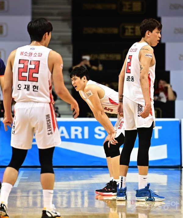 21일 경기도 안양실내체육관에서 열린 ‘2021-2022 KGC 인삼공사 정관장 프로농구’ 안양 KGC와 서울 SK의 경기에서 SK 김선형이 심판 판정에 아쉬워하고 있다.