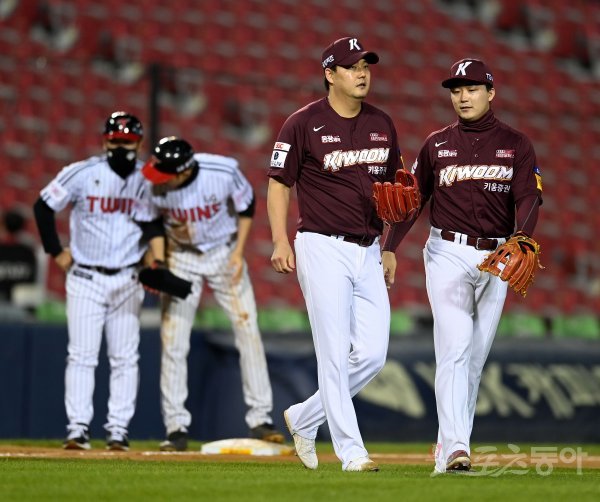 21일 서울 잠실야구장에서 ‘2021 신한은행 SOL KBO리그’ 키움 히어로즈와 LG 트윈스 경기가 열렸다. 9회말 무사 1루 키움 김태훈이 1루 견제를 하다 송구 실책으로 LG 1루주자가 3루까지 진루하자 아쉬워하고 있다.
