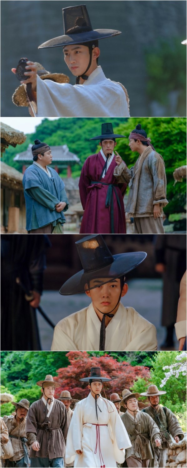 이언의 극한직업은 계속된다. 포승줄에 포박된 이언, 흙바닥에 주저앉아 넋을 놓고 있는 그의 모습은 짠내 그 자체. 비뚤어진 갓과 금방이라도 울 것 같은 촉촉한 눈망울이 웃음을 자아낸다. 그러나 이어진 사진 속 반전된 이언의 분위기가 설렘을 높인다. ‘수난 빌드업’ 끝에 어사 출두에 나선 이언의 위엄 넘치는 아우라가 시선을 사로잡는다. 이언의 옆을 든든히 지키는 육칠과 구팔의 달라진 모습도 흥미롭다. 고약한 악습과 부정, 무능한 탐관오리들을 휩쓸어버릴 이들 수사단의 폭풍 같은 활약이 궁금해진다.