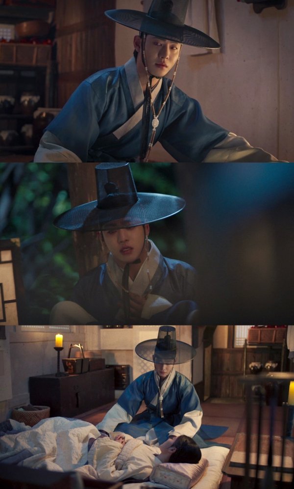 공개된 사진 속 하람은 잠든 홍천기(김유정 분)를 소중하게 바라보고 있다. 홍천기의 옆을 지키고 있는 하람의 마음이 절로 느껴져 애틋함을 자아낸다. 그러나 또 다른 사진에서는 하람이 아무도 몰래 혼자 괴로워하는 모습이 담겨 있어 가슴을 저릿하게 만든다. 하람은 자신 안에 거세지는 마왕의 기운을 느끼고, 비극적 운명을 감당하며 눈물과 고통의 밤을 보낸다고.