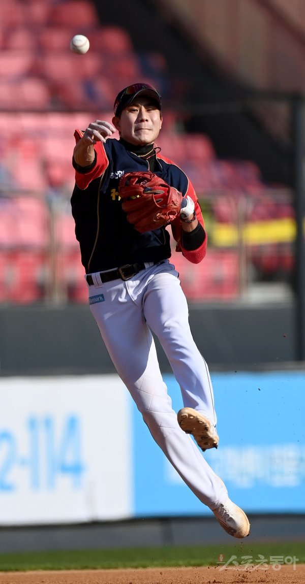 24일 수원KT위즈파크에서 ‘2021 신한은행 SOL KBO리그’ 키움 히어로즈와 KT 위즈 경기가 열렸다. 4회초 1사 KT 심우준이 땅볼 타구를 잡아 1루로 송구하고 있다.