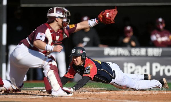 24일 수원KT위즈파크에서 ‘2021 신한은행 SOL KBO리그’ 키움 히어로즈와 KT 위즈 경기가 열렸다. 2회말 1사 2루 KT 안타 때 2루주자 유한준이 홈까지 달려 세이프 되고 있다.