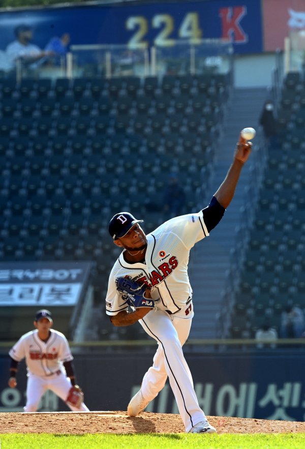 24일 서울 잠실야구장에서 ‘2021 신한은행 SOL KBO리그’ 두산 베어스와 LG 트윈스의 경기가 열렸다. 시즌 224번째 탈삼진을 기록한 두산 선발 미란다가 힘차게 볼을 던지고 있다.