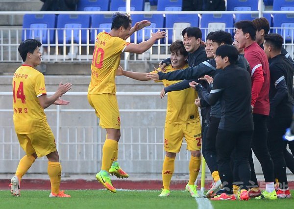 24일 경기도 수원월드컵경기장에서 열린 ‘하나원큐 K리그1 2021’ 수원FC와 광주FC의 경기에서 광주 이희균이 골을 성공시킨 후 동료들의 축하를 받고 있다.