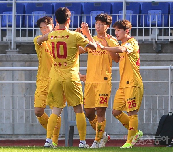24일 경기도 수원월드컵경기장에서 열린 ‘하나원큐 K리그1 2021’ 수원FC와 광주FC의 경기에서 광주 엄지성이 전반전에 선제골을 성공시킨 후 동료들과 기쁨을 나누고 있다.