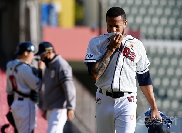 24일 서울 잠실야구장에서 ‘2021 신한은행 SOL KBO리그’ 두산 베어스와 LG 트윈스의 경기가 열렸다. 5회초 1사 1, 3루에서 두산 선발 미란다가 교체되고 있다.
