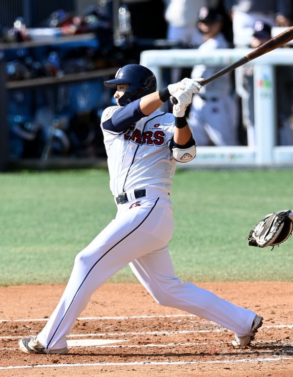 24일 서울 잠실야구장에서 ‘2021 신한은행 SOL KBO리그’ 두산 베어스와 LG 트윈스의 경기가 열렸다. 2회말 1사 2, 3루에서 두산 강승호가 1타점 적시타를 날리고 있다.