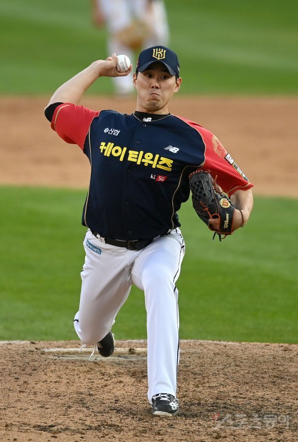 24일 수원KT위즈파크에서 ‘2021 신한은행 SOL KBO리그’ 키움 히어로즈와 KT 위즈 경기가 열렸다. 8회말 1사 1루 상황에서 등판해 무실점으로 막으며 세이를 따낸 KT 김재윤이 역투하고 있다.