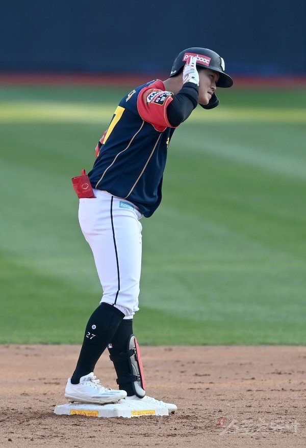 24일 수원KT위즈파크에서 ‘2021 신한은행 SOL KBO리그’ 키움 히어로즈와 KT 위즈 경기가 열렸다. 8회말 1사 1,2루 KT 배정대가 2타점 중전 2루타를 치고 2루에서 기뻐하고 있다.