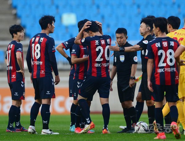 24일 경기도 수원월드컵경기장에서 열린 ‘하나원큐 K리그1 2021’ 수원FC와 광주FC의 경기에서 수원FC가 광주에 1-3으로 패한 뒤 선수들이 심판에게 비디오판독 결과를 어필하고 있다.