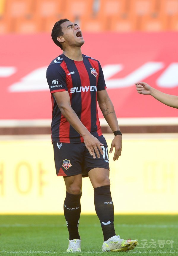 24일 경기도 수원월드컵경기장에서 열린 ‘하나원큐 K리그1 2021’ 수원FC와 광주FC의 경기에서 수원FC 무릴로가 골대를 벗어난 슈팅에 아쉬워하고 있다.