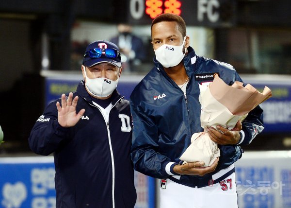 24일 서울 잠실야구장에서 ‘2021 신한은행 SOL KBO리그’ 두산 베어스와 LG 트윈스의 DH 1차전 경기가 열렸다. 9회말 1사 1, 3루에서 두산 박건우의 끝내기 내야땅볼로 승리한 뒤 시즌 역대 최다 탈삼진을 기록한 미란다가 김태형 감독과 기념촬영을 하고 있다.