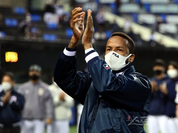 24일 서울 잠실야구장에서 ‘2021 신한은행 SOL KBO리그’ 두산 베어스와 LG 트윈스의 DH 1차전 경기가 열렸다. 9회말 1사 1, 3루에서 두산 박건우의 끝내기 내야땅볼로 승리한 뒤 시즌 역대 최다 탈삼진을 기록한 미란다가 팬들을 향해 박수를 보내고 있다.