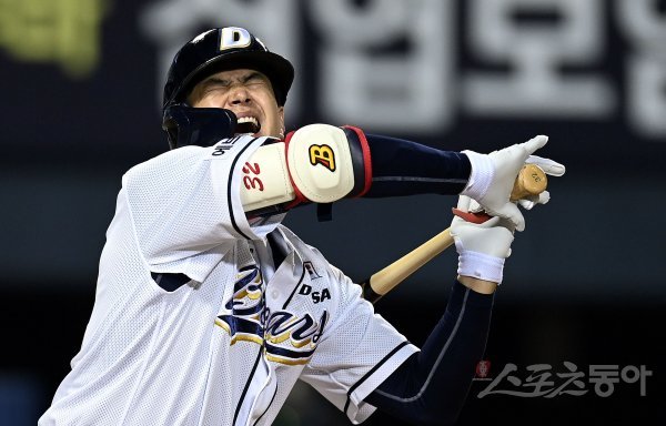 24일 서울 잠실야구장에서 ‘2021 신한은행 SOL KBO리그’ 두산 베어스와 LG 트윈스의 DH 2차전 경기가 열렸다. 2회말 2사 1, 2루에서 두산 김재환이 스윙을 한 후 아쉬워하고 있다.