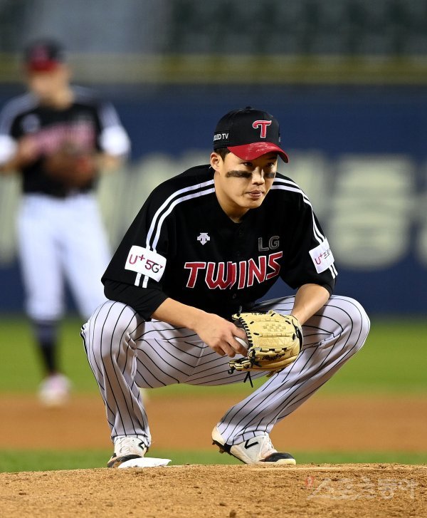 24일 서울 잠실야구장에서 ‘2021 신한은행 SOL KBO리그’ 두산 베어스와 LG 트윈스의 DH 2차전 경기가 열렸다. LG 선발 임찬규가 투구에 앞서 경기를 준비하고 있다.