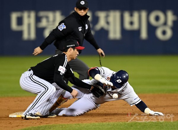 24일 서울 잠실야구장에서 ‘2021 신한은행 SOL KBO리그’ 두산 베어스와 LG 트윈스의 DH 2차전 경기가 열렸다. 5회말 1사 2루에서 두산 페르난데스가 적시타를 날린 뒤 2루까지 진루하고 있다.