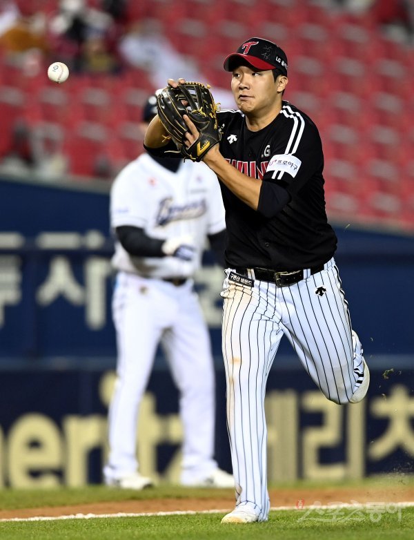 24일 서울 잠실야구장에서 ‘2021 신한은행 SOL KBO리그’ 두산 베어스와 LG 트윈스의 DH 2차전 경기가 열렸다. 5회말 1사 1, 3루에서 LG 문보경이 내야땅볼 타구를 포구 실책하고 있다.