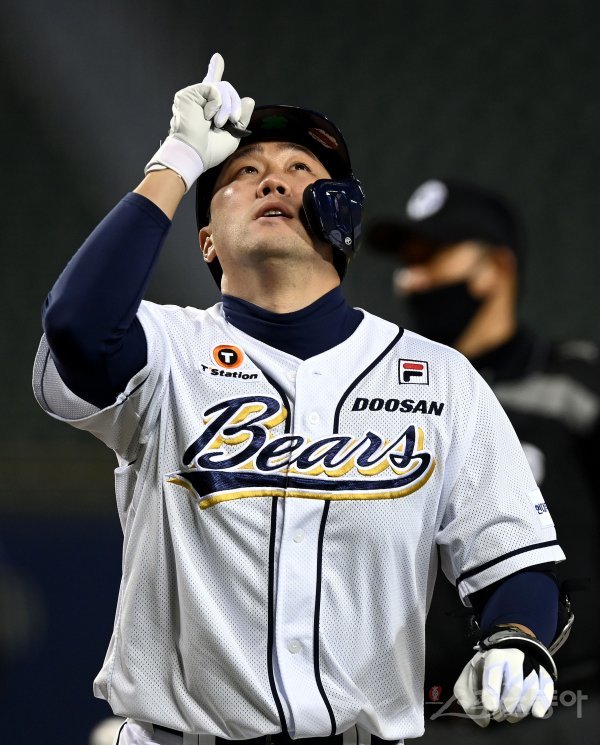 24일 서울 잠실야구장에서 '2021 신한은행 SOL KBO리그' 두산 베어스와 LG 트윈스의 DH 2차전 경기가 열렸다. 9회말 2사에서 두산 대타 양석환이 동점 솔로 홈런을 쏘아 올린 뒤 환호하고 있다. 잠실 | 김민성 기자 marineboy@donga.com