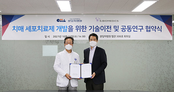 차 의과학대학교 분당 차병원은 에스바이오메딕스와 치매 세포치료제 개발을 위한 기술이전 협약을 맺었다.에스바이오메딕스, 신경계질환 치료 기반 구축