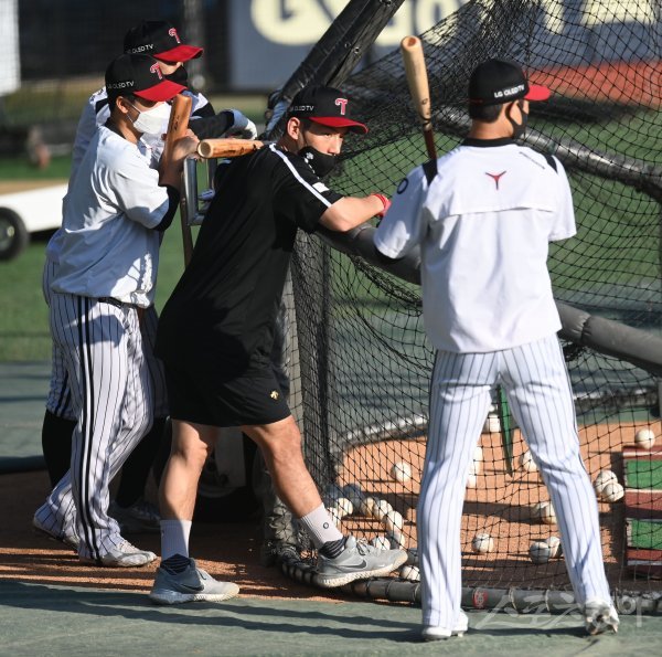 25일 서울 잠실야구장에서 ‘2021 신한은행 SOL KBO리그’ 롯데 자이언츠와 LG 트윈스 경기가 열린다. LG 서건창이 동료들의 훈련을 바라보고 있다.